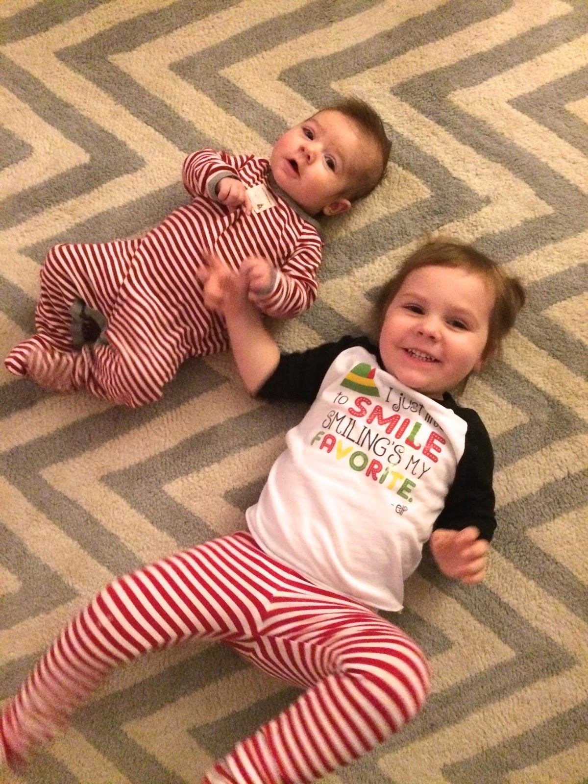 The girls and I finished Christmas Eve opening our traditional Christmas Eve gift of new pajamas. I tried my best to get a few good pictures in their matching pi's, but they were sure trying their best to make that impossible! I mean is it really to much to ask to have ONE picture of both kids looking at the camera, not crying, and not having their finger in their belly button?!?! Apparently it is. However, the stockings did get hung and the cookies did get put out for Santa. We read The Night Before Christmas and the Story of Christmas at least three times each and the kids went to bed.